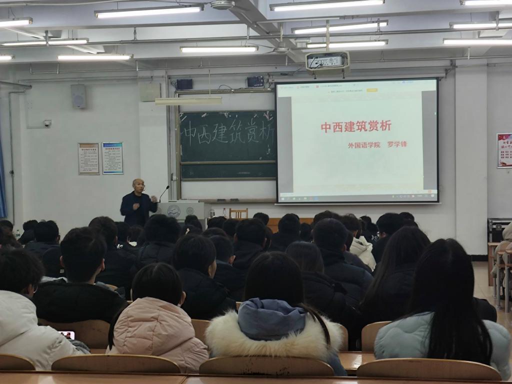 为了让同学们能以英语为工具和学习目标,将建筑知识和英语语言有机融合,EMC易倍12月7日特邀外国语公司教授罗学锋做《中西建筑鉴赏》讲座。